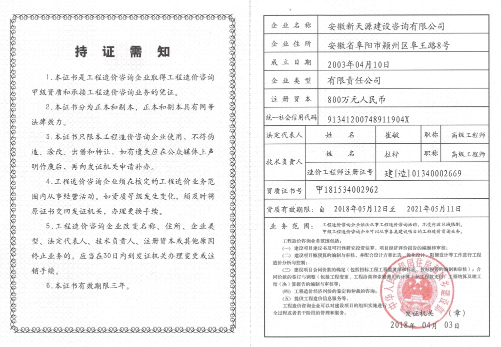 2008年11月取得工程造價(jià)資質(zhì)證書并成為阜陽市審計(jì)局審計(jì)協(xié)審定點(diǎn)單位;